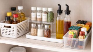キッチン 調味料が倒れる・汚れるを防ぐ!100円グッズで整えるキッチン収納の工夫 調味料が倒れる・棚が汚れるとお悩みの方へ。100円グッズを使って、調味料を安定して収納する簡単なキッチン整理の工夫を紹介します。出し入れしやすく、掃除もラクに続けられます。 キッチン